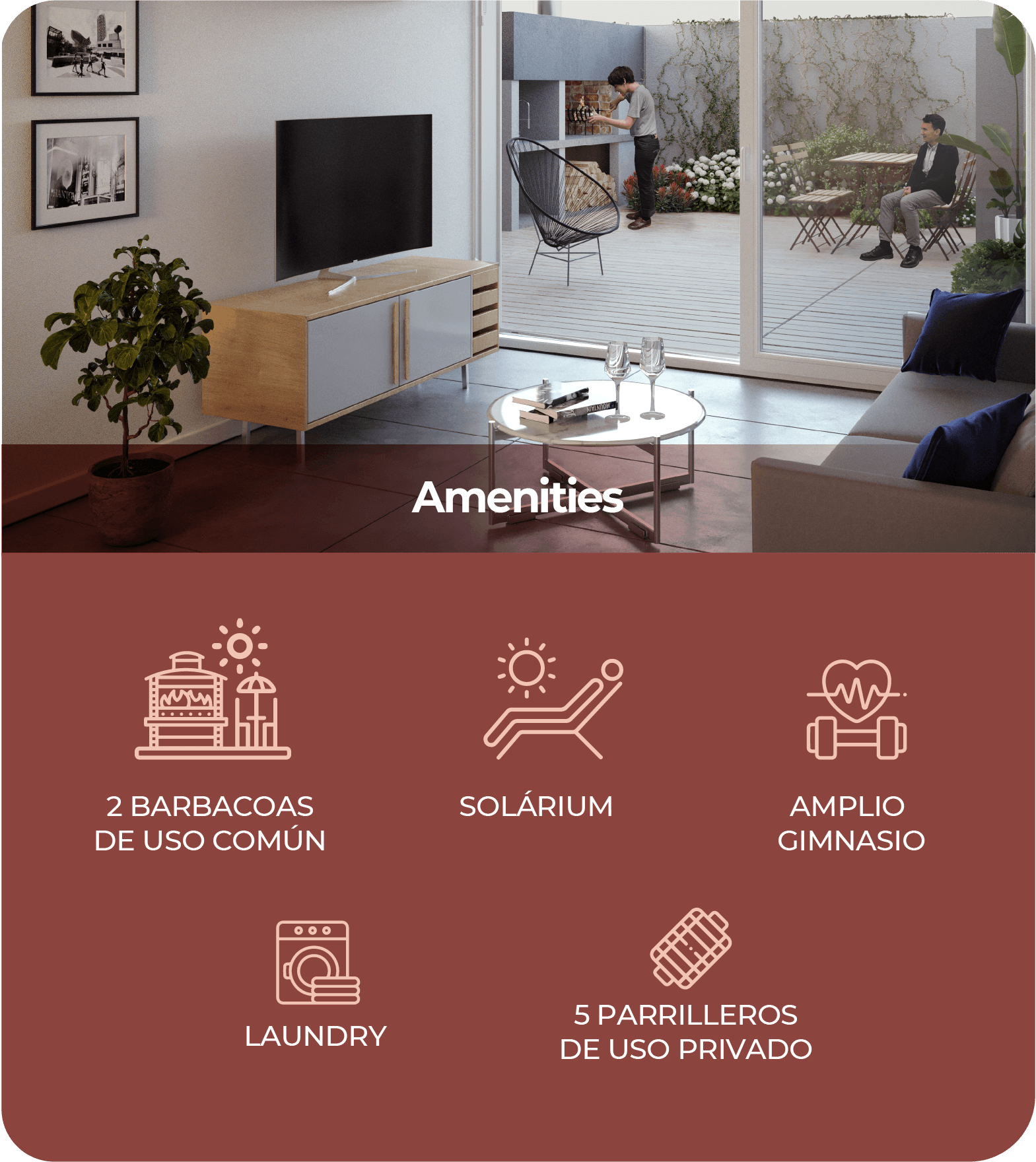 amenities -incluidos gimnasio, barbacoas y solárium, hacen de este proyecto la